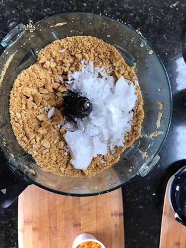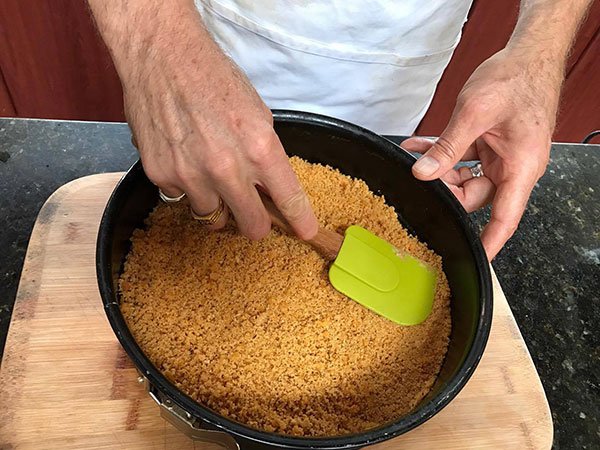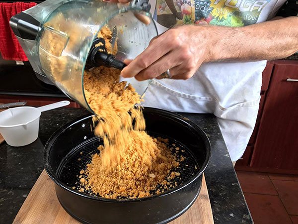 Process in a processor until the mix is lightly holding together. You want it to still be a little crumbly. Pat it firmly into a springform pan and set in fridge.