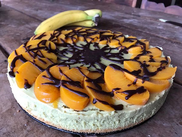 Decorate with slices of peach and drizzle with some chocolate sauce.